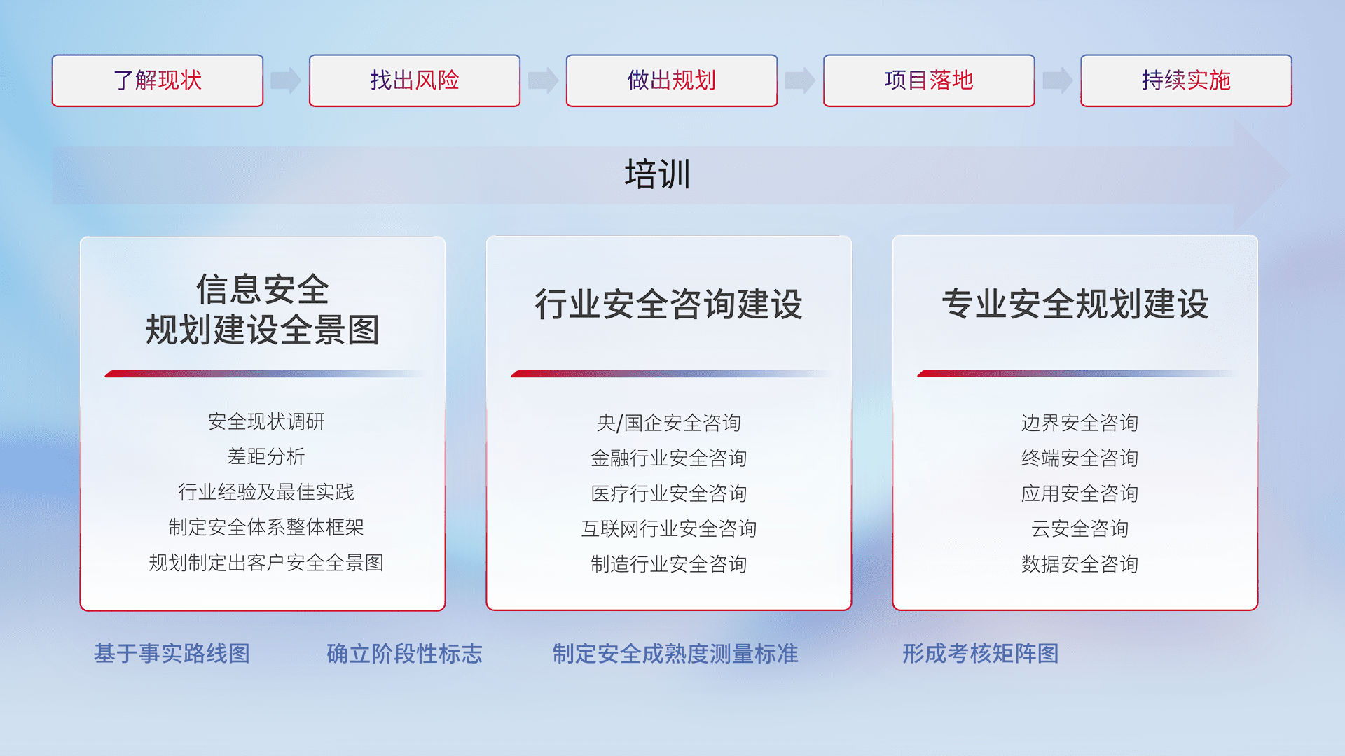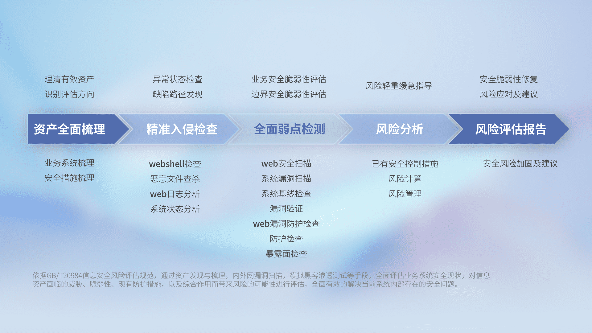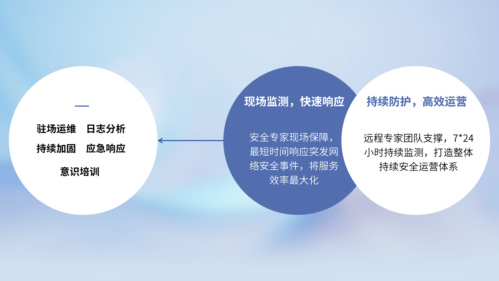 针对客户行业特性,,,以专业的安全服务+多厂商联合解决方案提供专属的一站式安全管理服务,,帮助客户全面感知网络空间威胁,,,,基于识别、、检测、、分析、、防护、、监测、、、、响应的服务理论模型,,,从方案咨询、、、集成交付、、评估验证、、、、优化加固、、、运维运营,,,致力于为客户提供完整的闭环管理式安全服务。。。。以实战经验为客户打造高抵御风险的安全体系,,,帮助客户发现威胁、、、对抗威胁、、、处置威胁,,不断积累安全对抗能力,,持续保障数字化安全。。